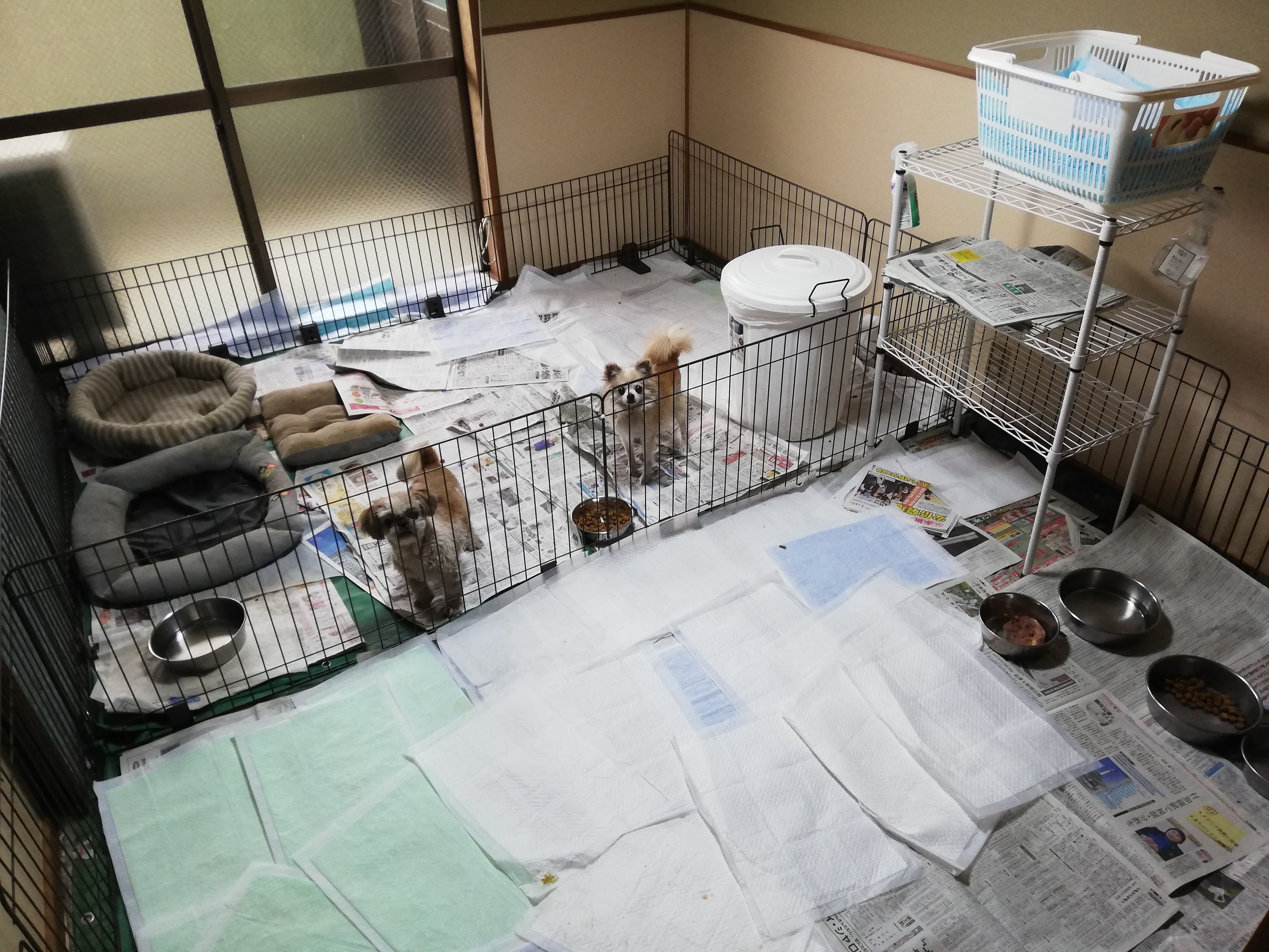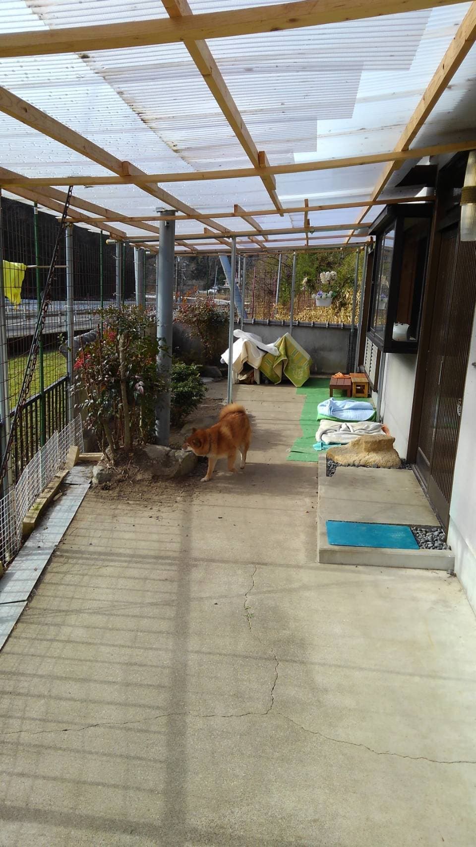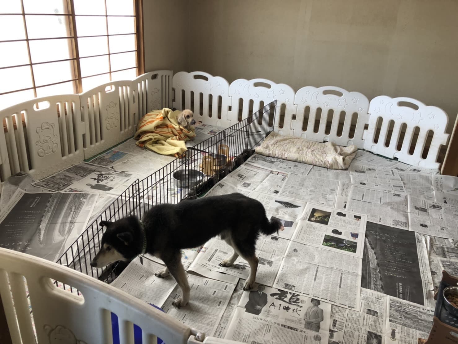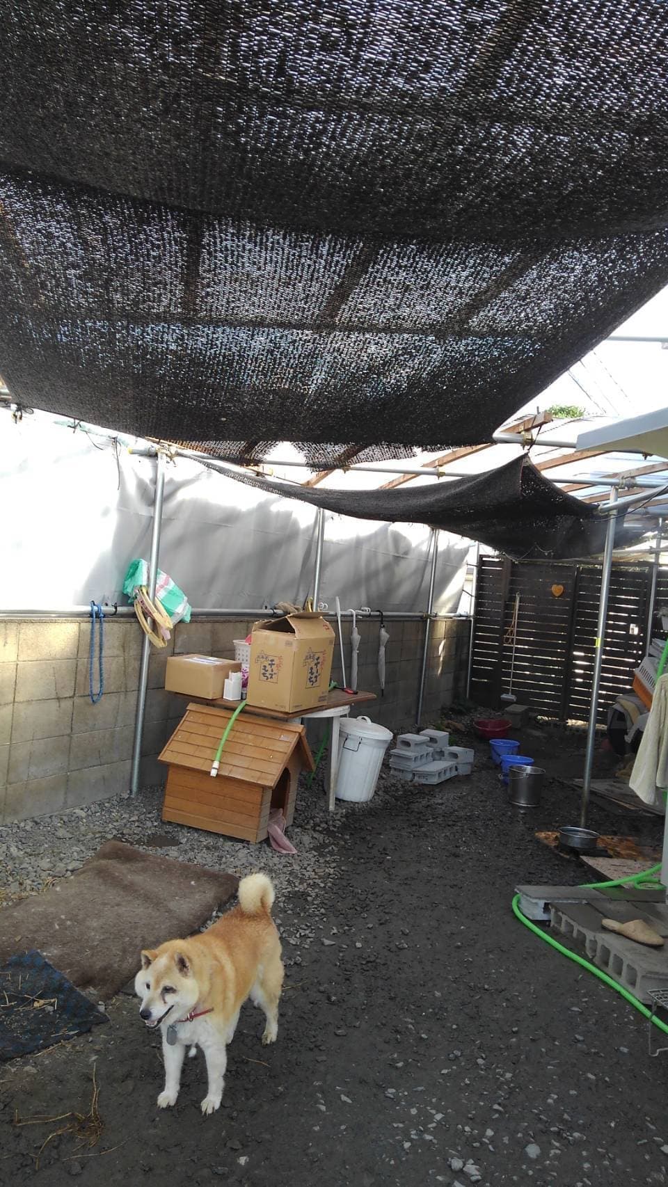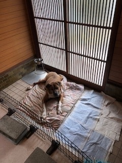免疫不全の秋田犬のリュウ君は夏季の昼、冬季の夜は暑さ寒さを室内でしのいでいます。