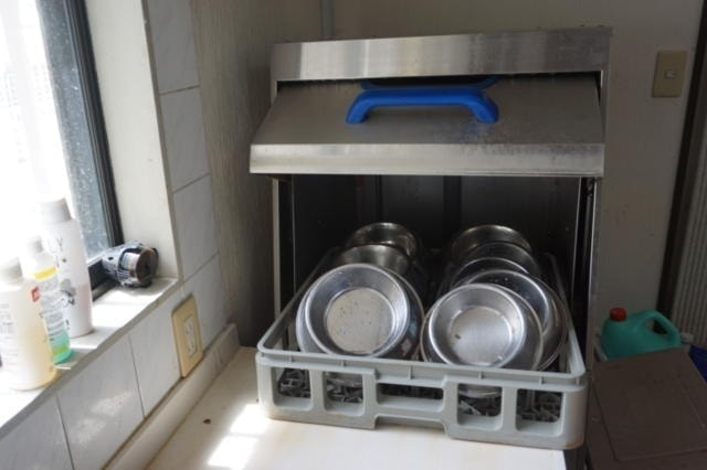 大型業務用食器洗浄機で80℃の熱水で食器を清潔に保つ。