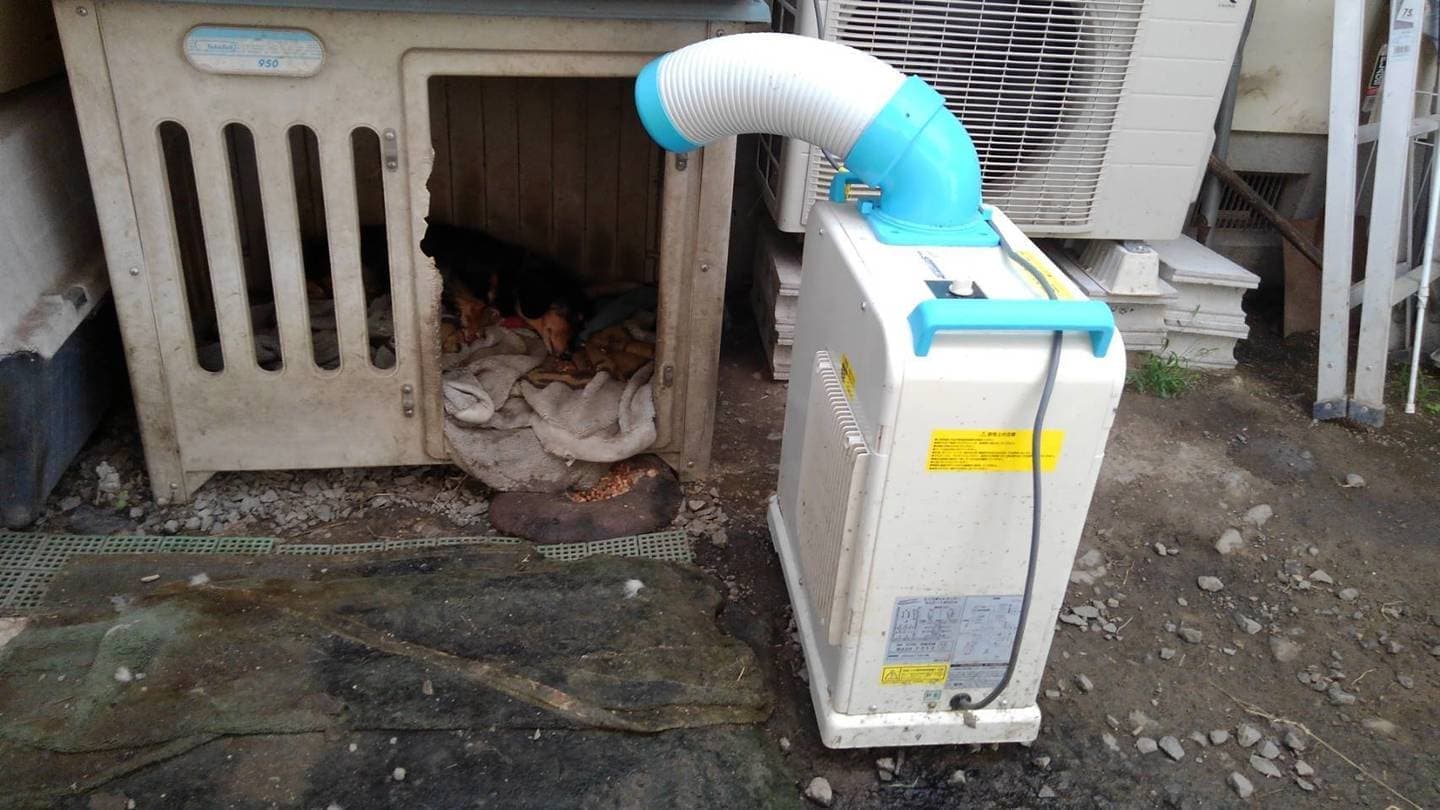犬小屋を包んでいる毛布に、水を含ませて、犬小屋全体を冷しています。
