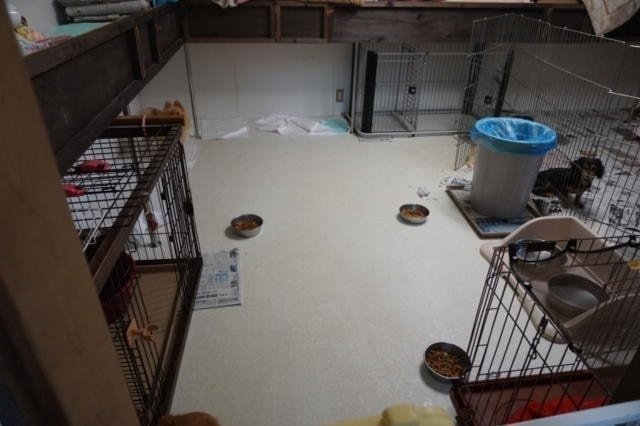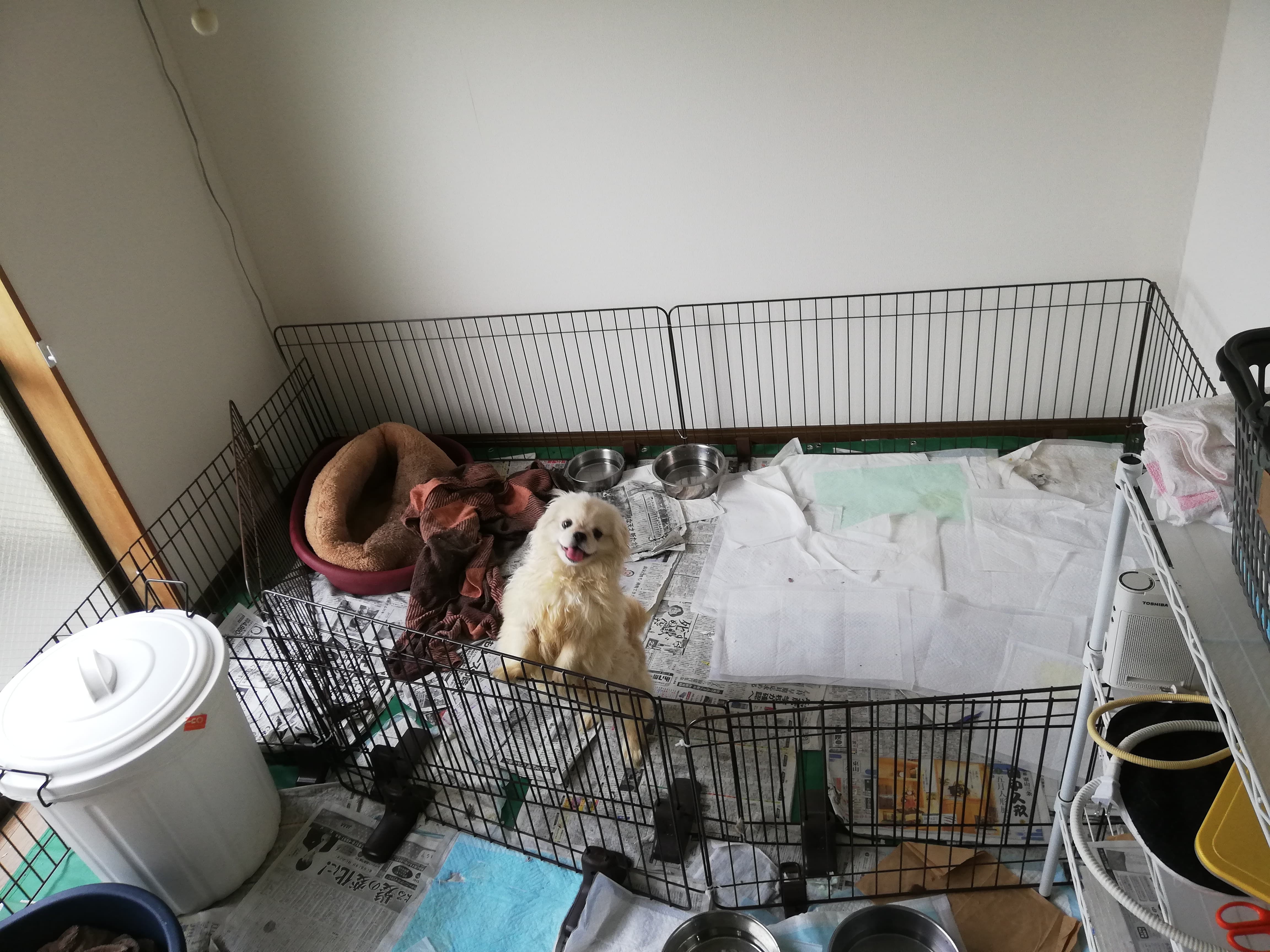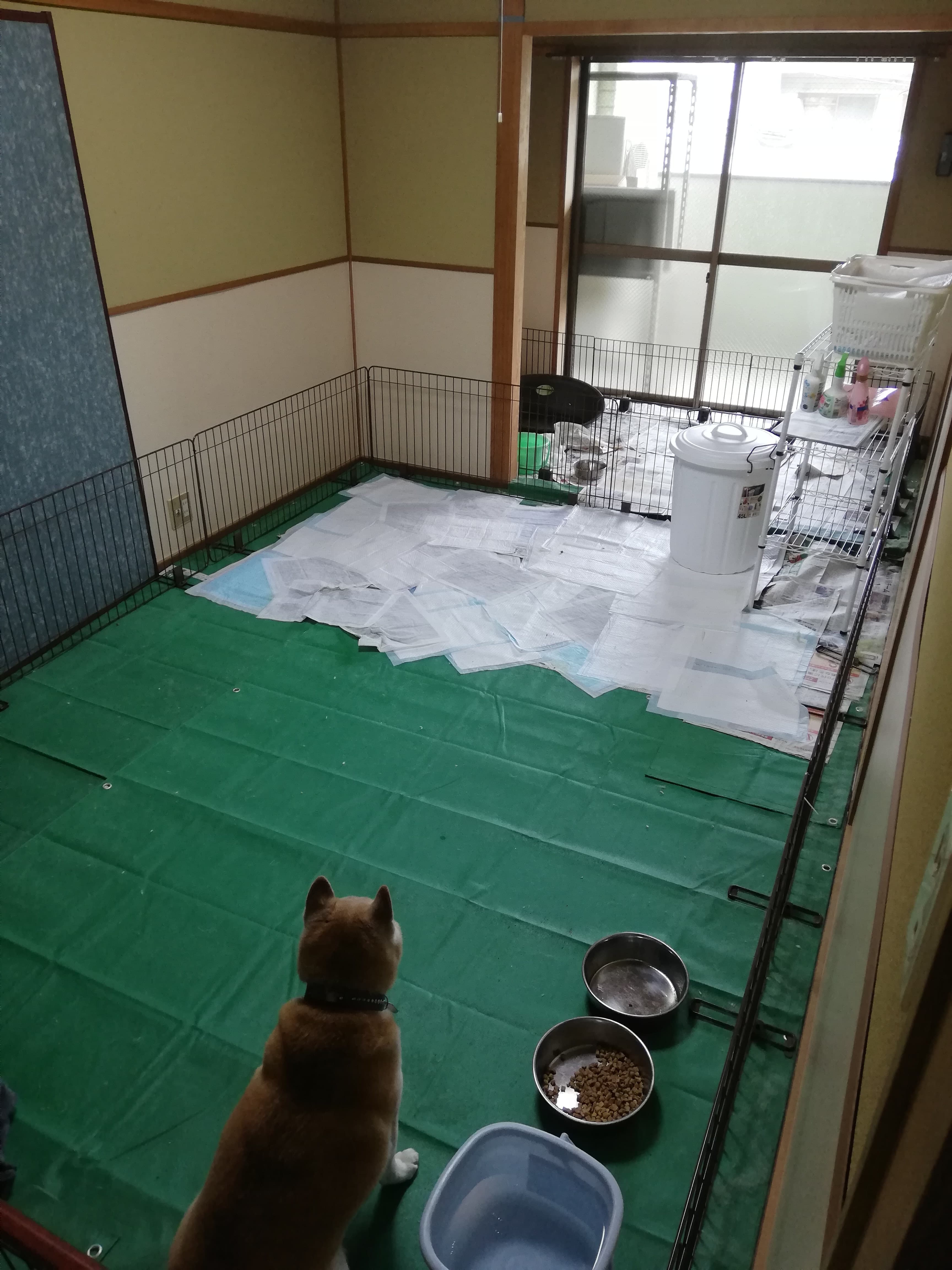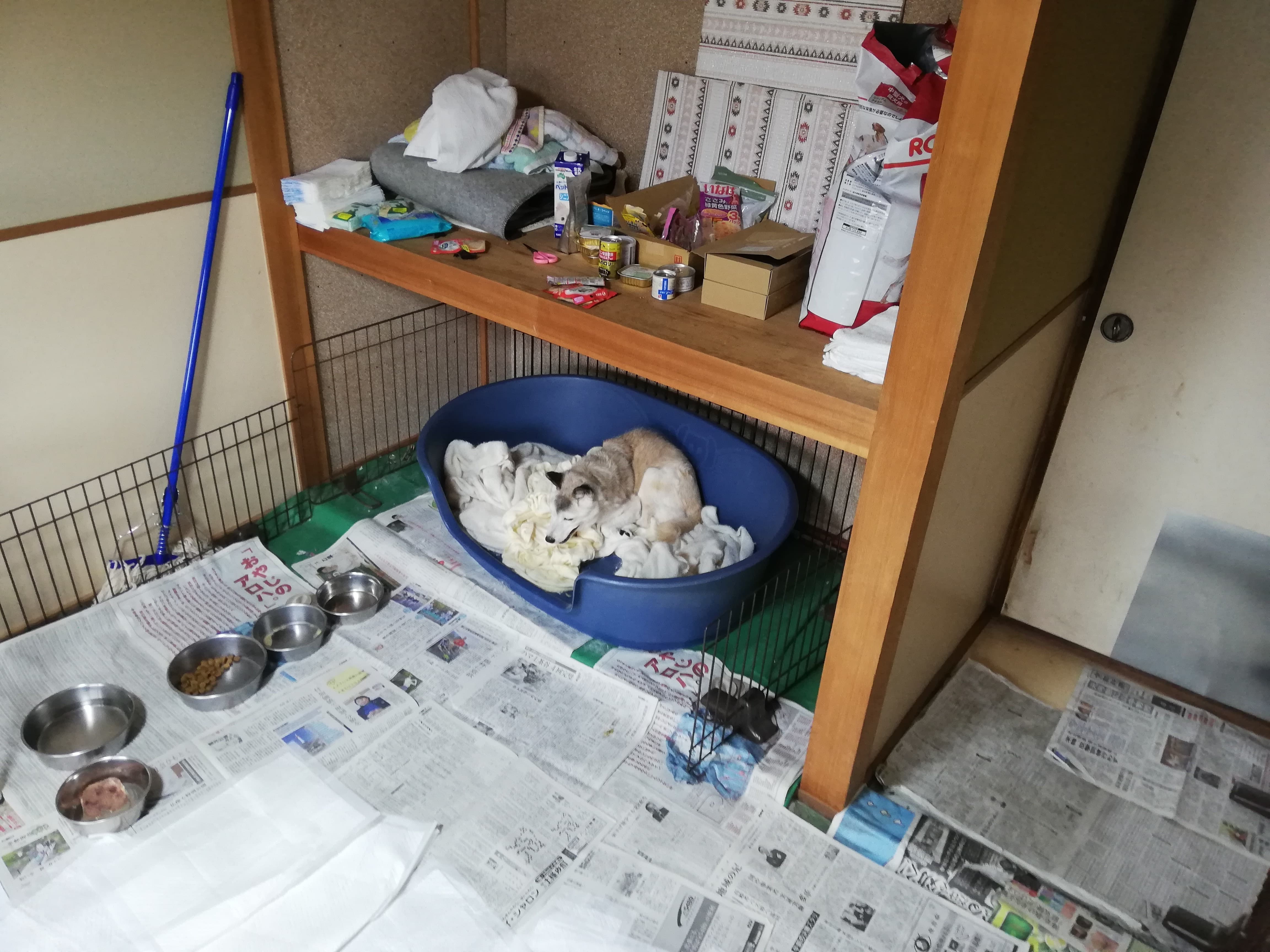 免疫不全の秋田犬のリュウ君は夏季の昼、冬季の夜は暑さ寒さを室内でしのいでいます。