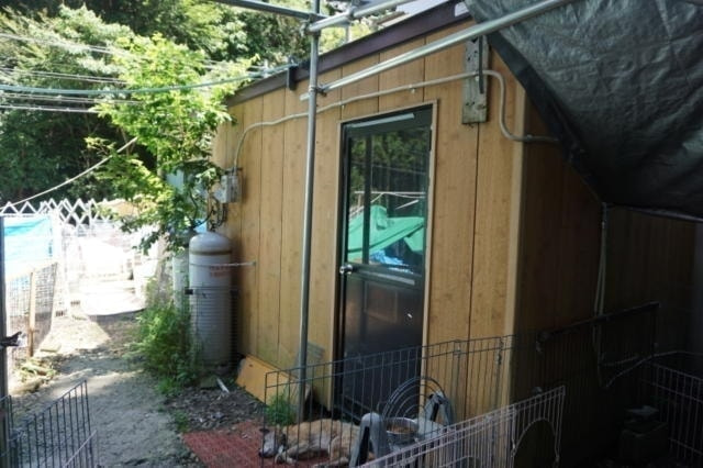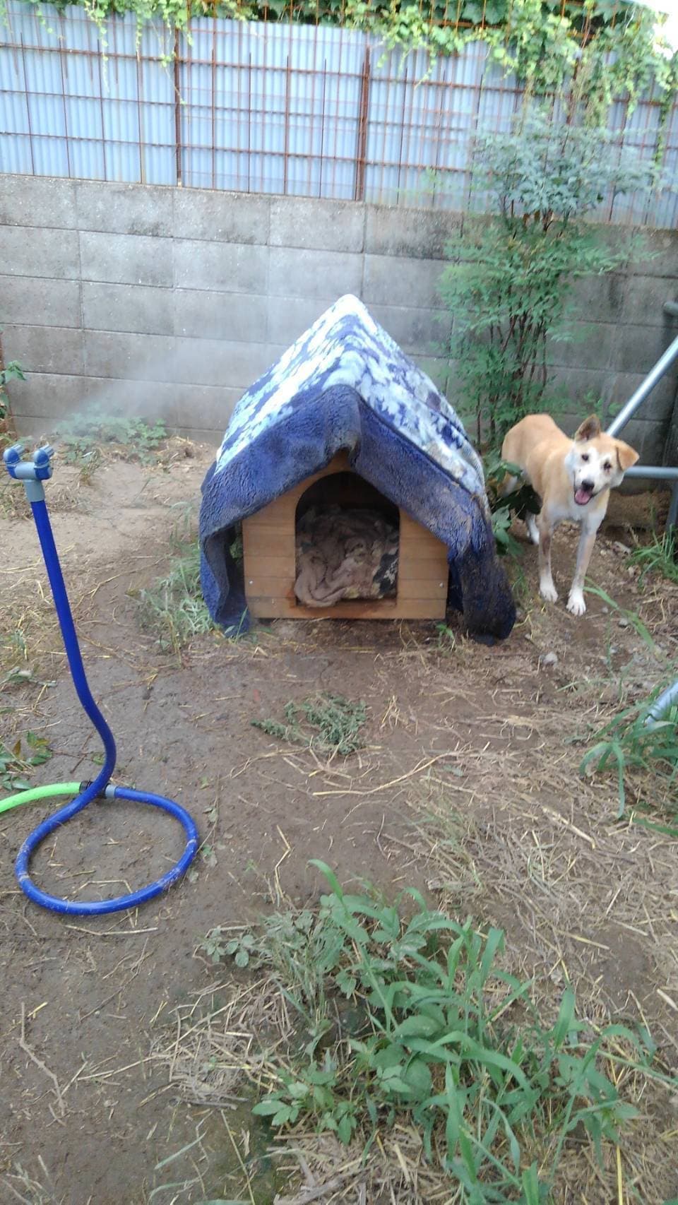 犬小屋を包んでいる毛布に、水を含ませて、犬小屋全体を冷しています。
