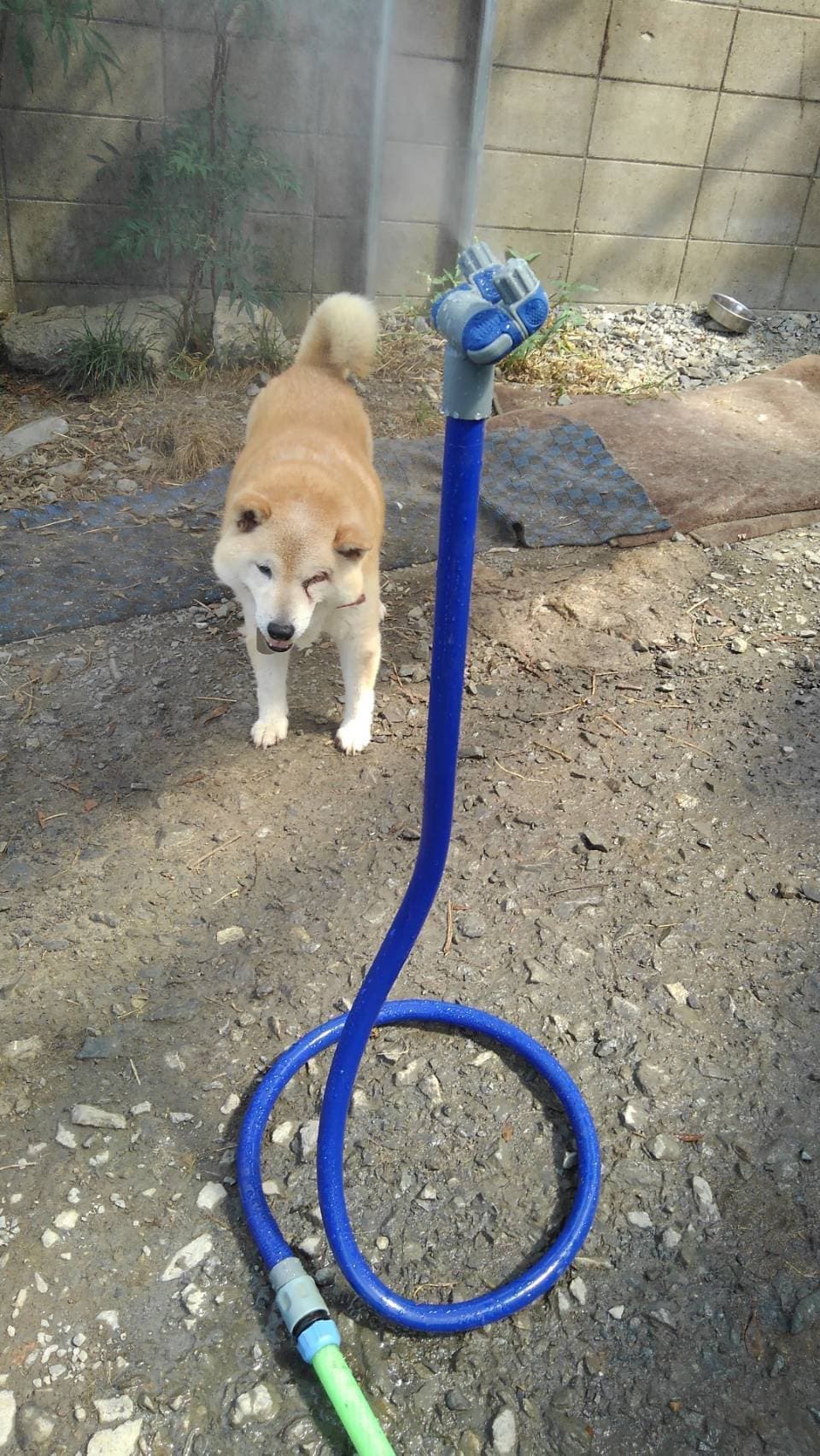 暑さ対策の一環で、スタンドガーデンミストを外の大型犬にも設置しています。